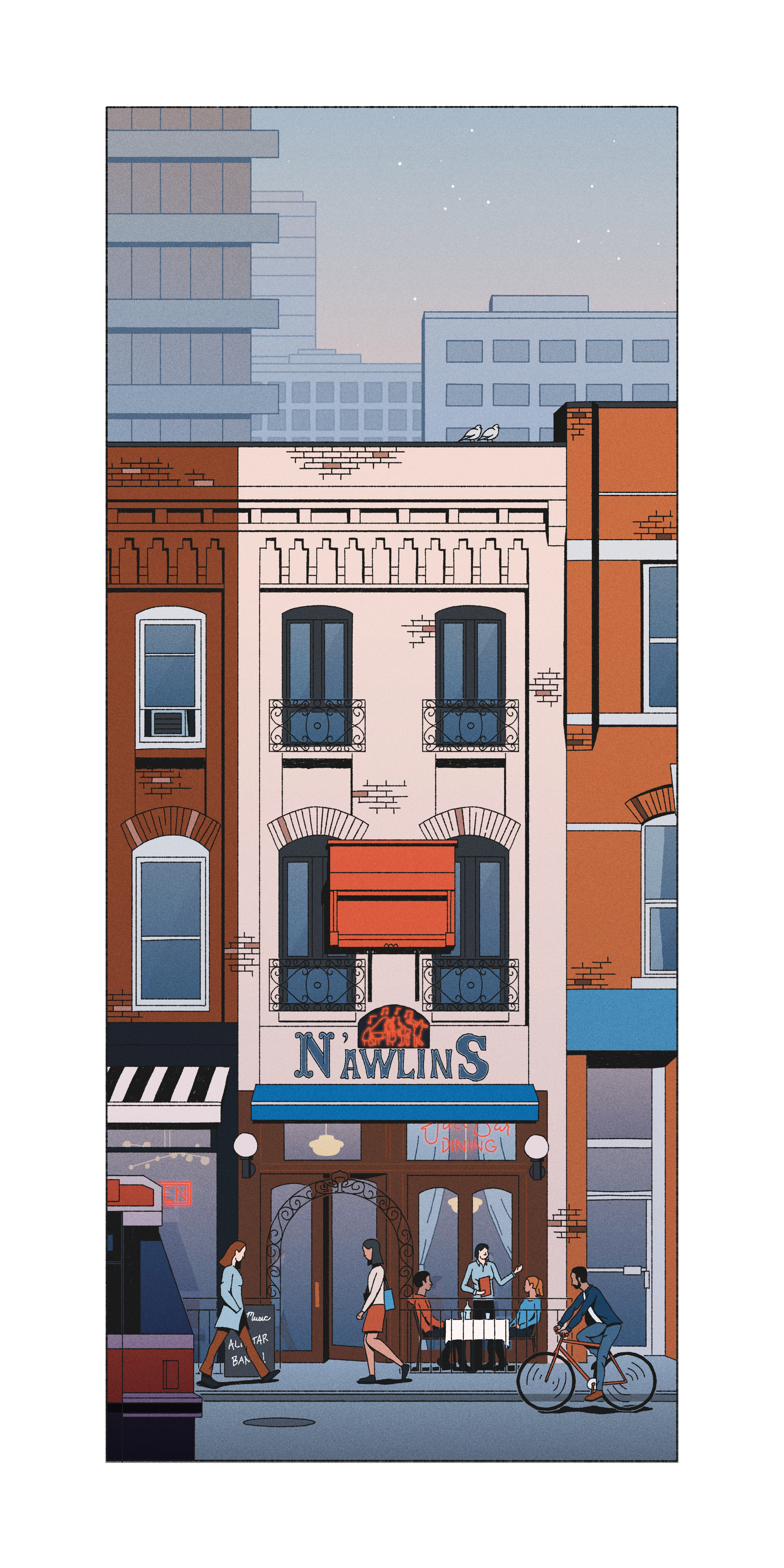 This illustration pays homage to N’Awlins Jazz Bar, a beloved and lively Toronto restaurant that brought the spirit of New Orleans to Canada. Known for its authentic Creole and Cajun cuisine, it transported diners to the heart of Louisiana. The vibrant ambiance, complete with live jazz music and snug decor, made it a cherished spot. Sadly, like many establishments, N’Awlins closed its doors during the COVID-19 pandemic. This artwork is a heartfelt tribute to the family behind N’Awlins and all those who cherished this cozy haven for delicious food and soulful music. It captures the special place it held in the hearts of many, including my own fond memories of enjoying drinks at the bar amidst live music.