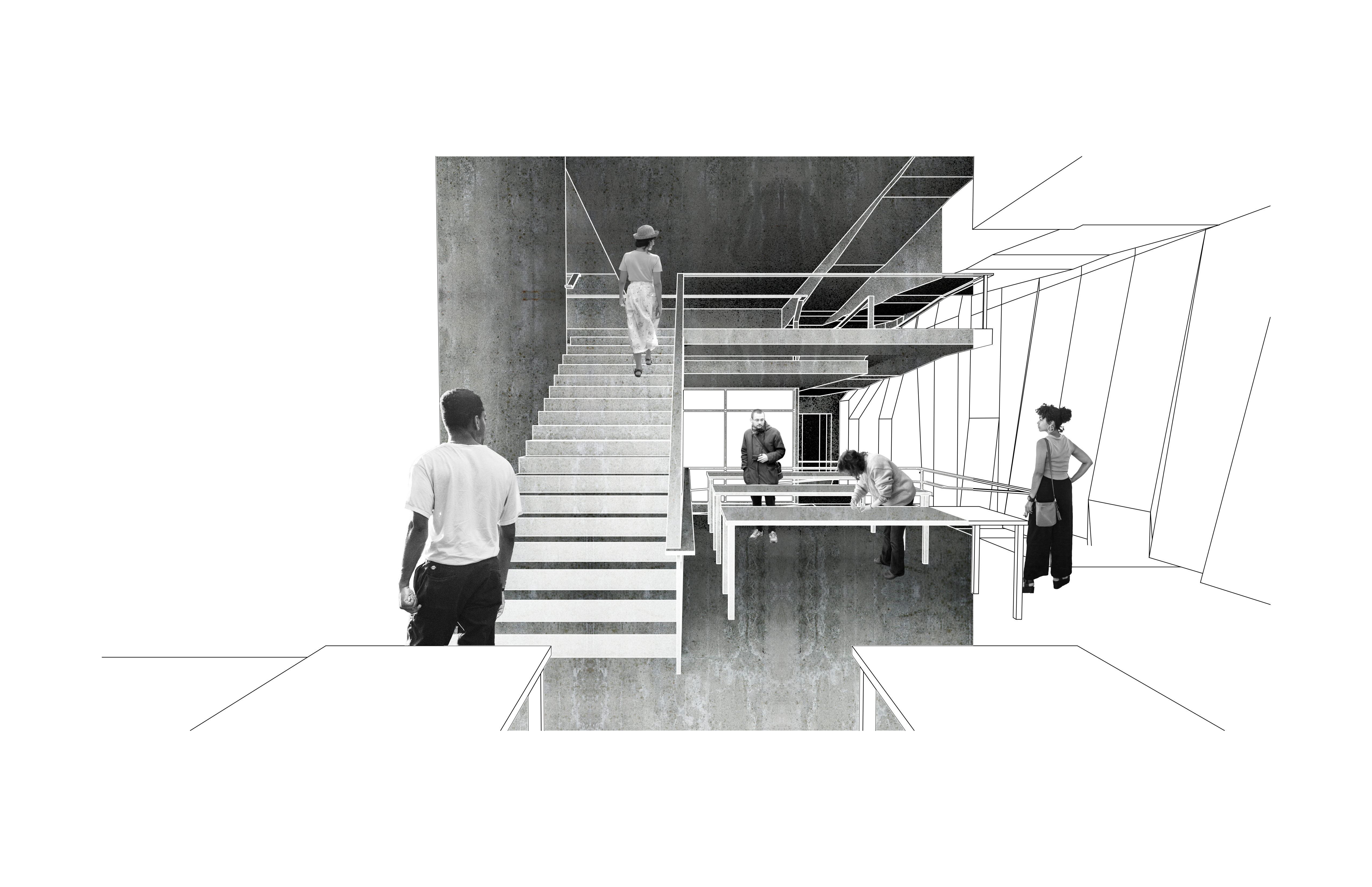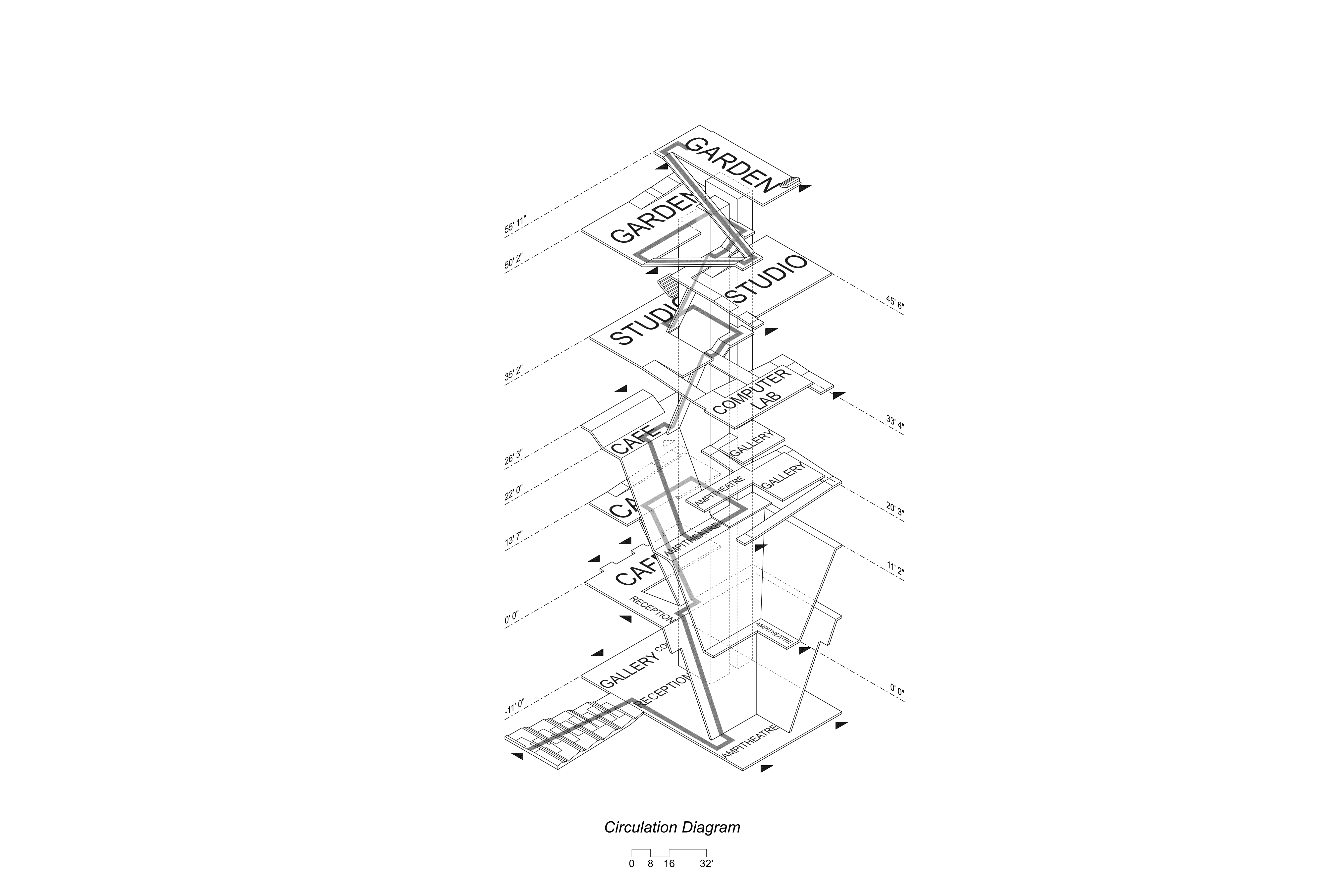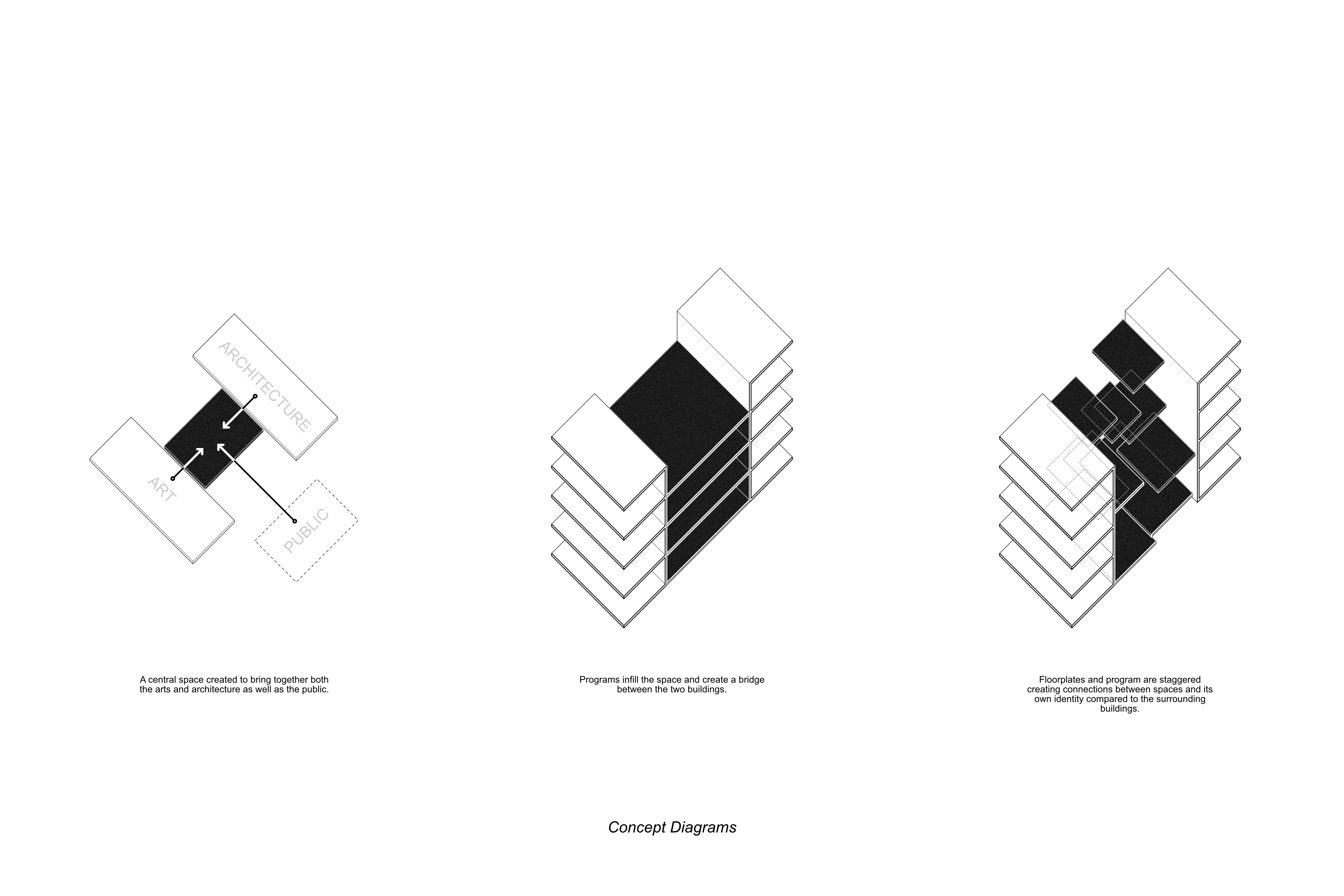 This project aimed to create a space for both art and architecture students as well as the surrounding public. The floorplates are staggered and overlap to create interconnection between the different program spaces allowing for occupants to observe and experience the other programs throughout the building. A large amphitheater space runs through the project acting as a circulation connection between the different spaces. The sound and visual connections between spaces are mitigated through different partitions based on preferences, such as adjustable curtains or movable partitions. On the exterior, these hanging floorplates protrude from the facade hinting to those passing by the interior layout of the project.