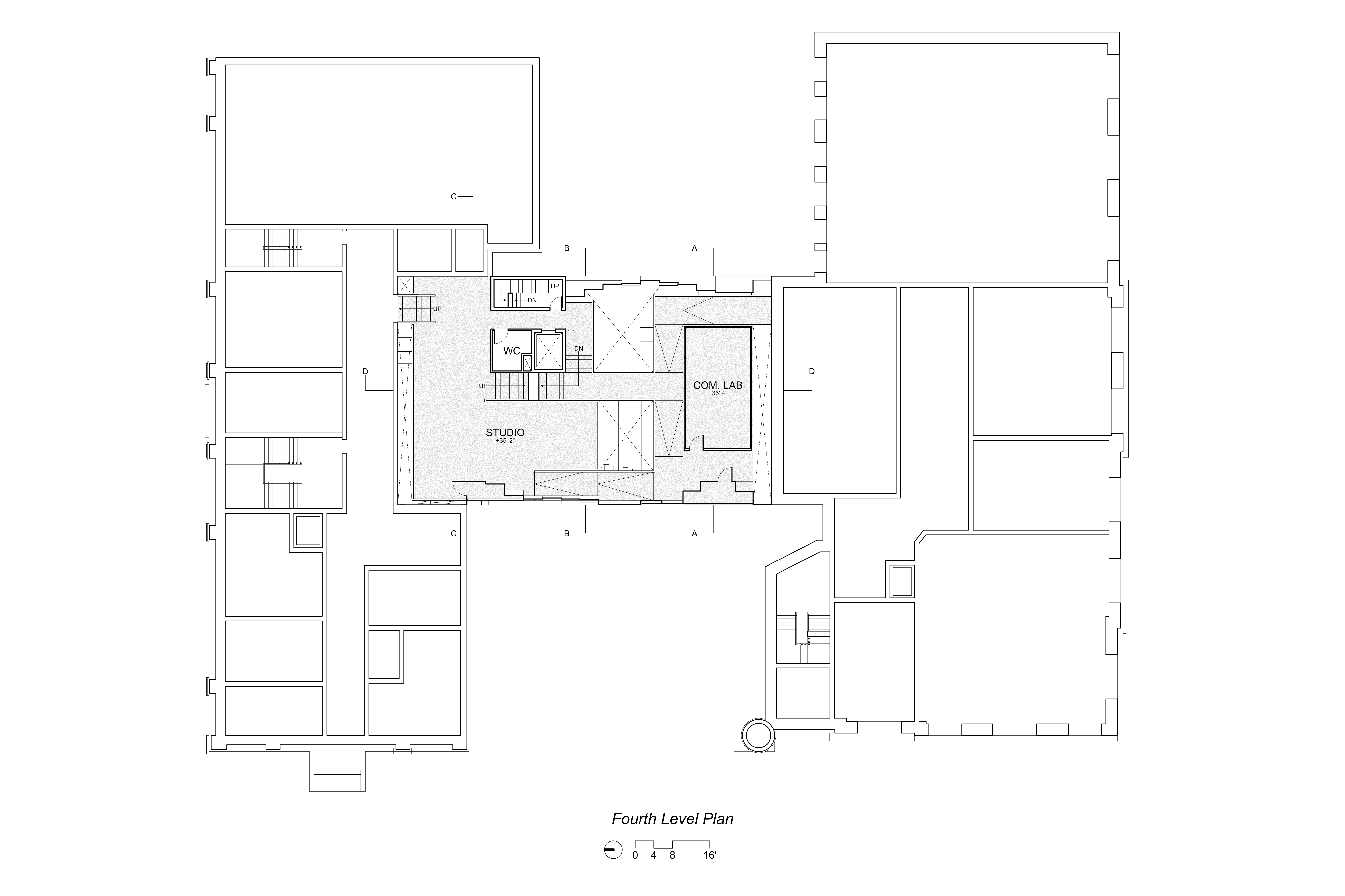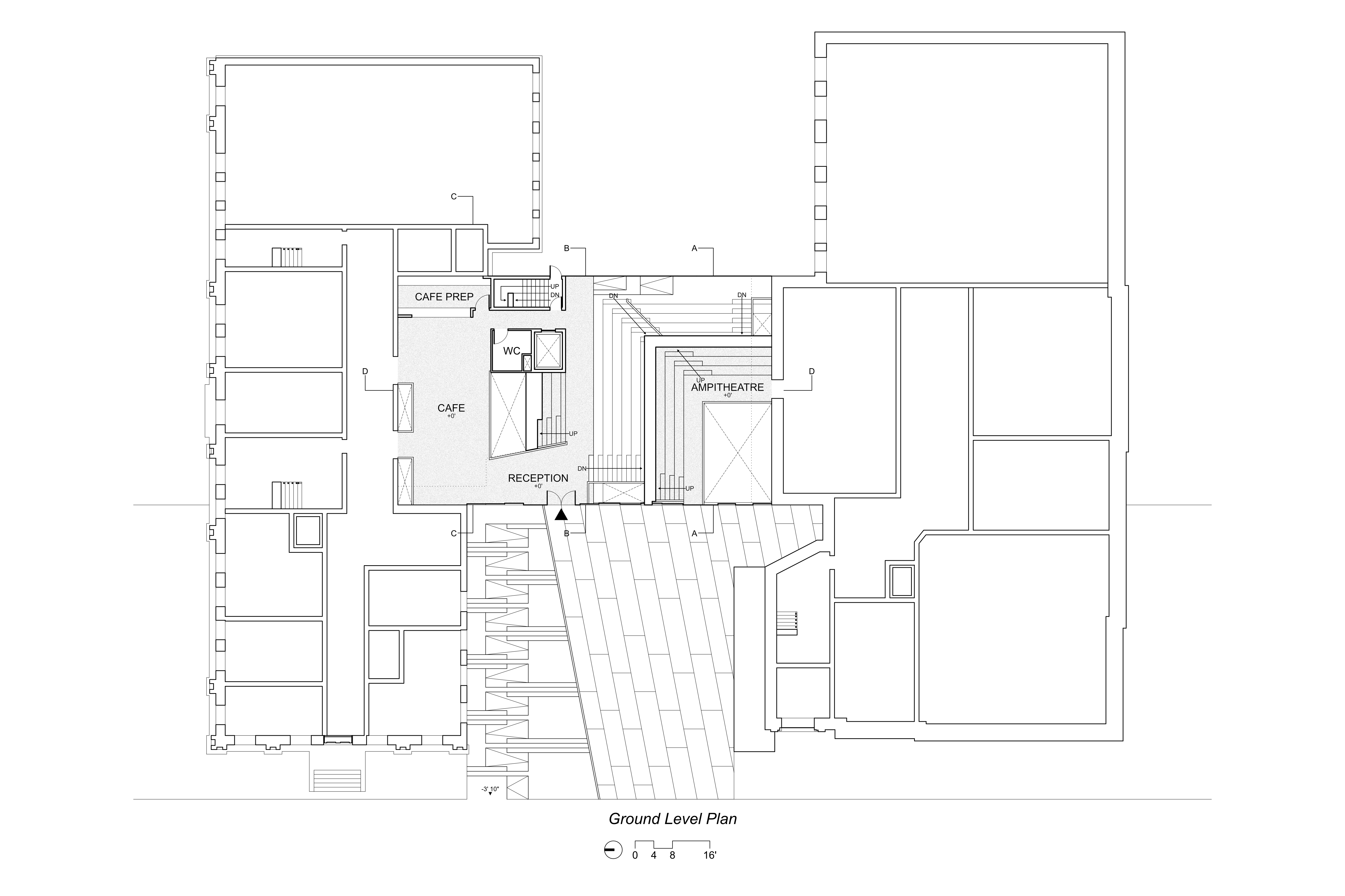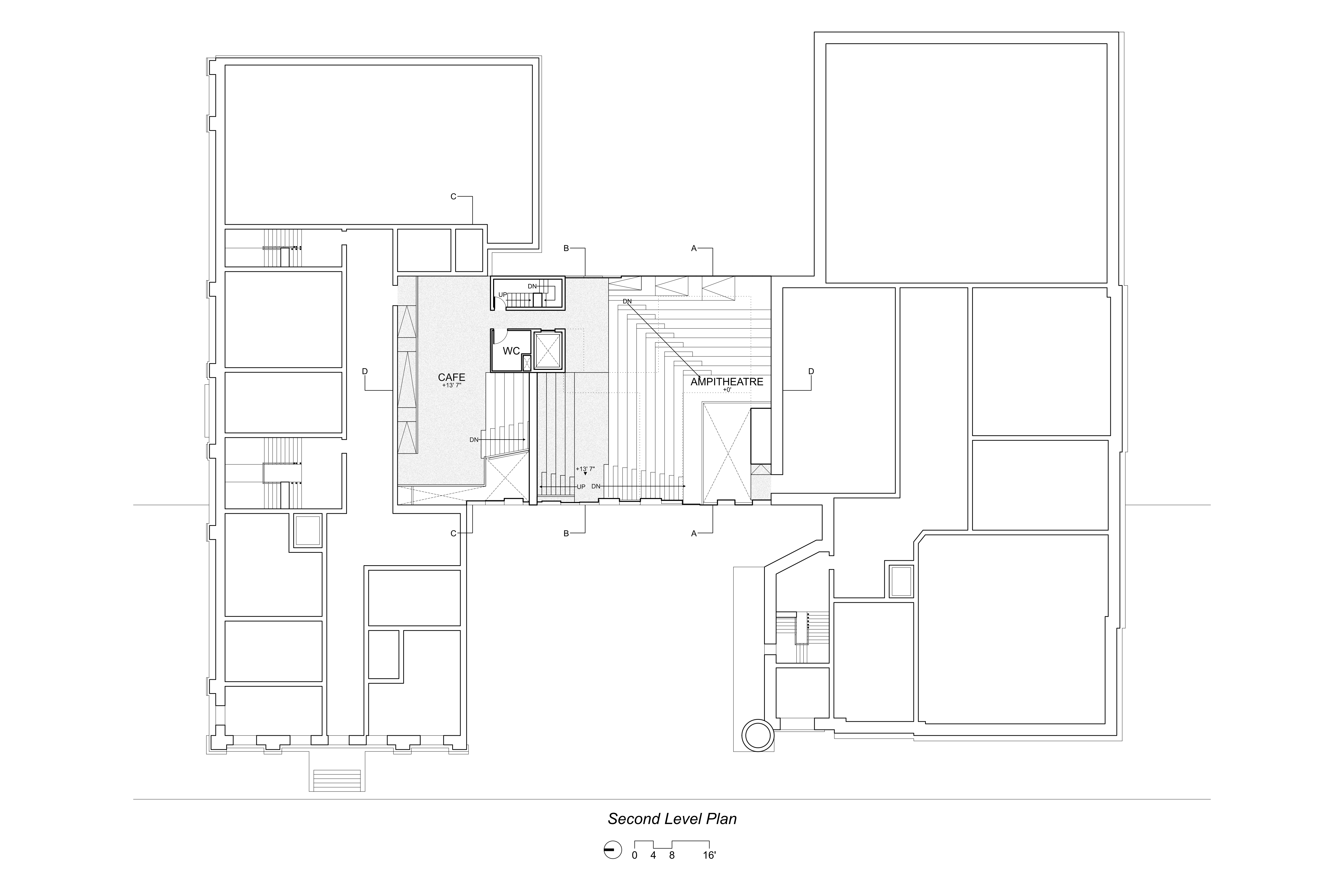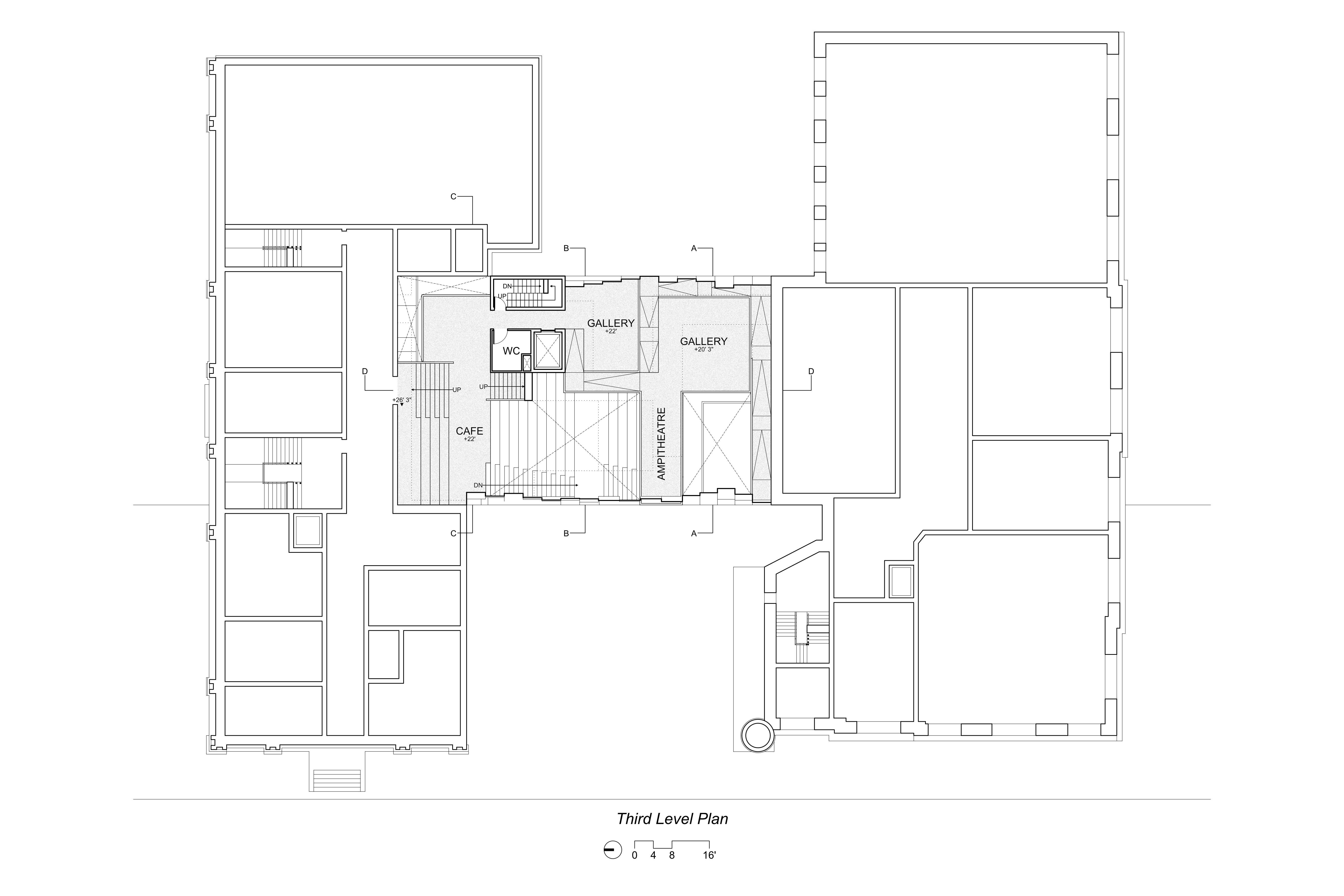 This project aimed to create a space for both art and architecture students as well as the surrounding public. The floorplates are staggered and overlap to create interconnection between the different program spaces allowing for occupants to observe and experience the other programs throughout the building. A large amphitheater space runs through the project acting as a circulation connection between the different spaces. The sound and visual connections between spaces are mitigated through different partitions based on preferences, such as adjustable curtains or movable partitions. On the exterior, these hanging floorplates protrude from the facade hinting to those passing by the interior layout of the project.