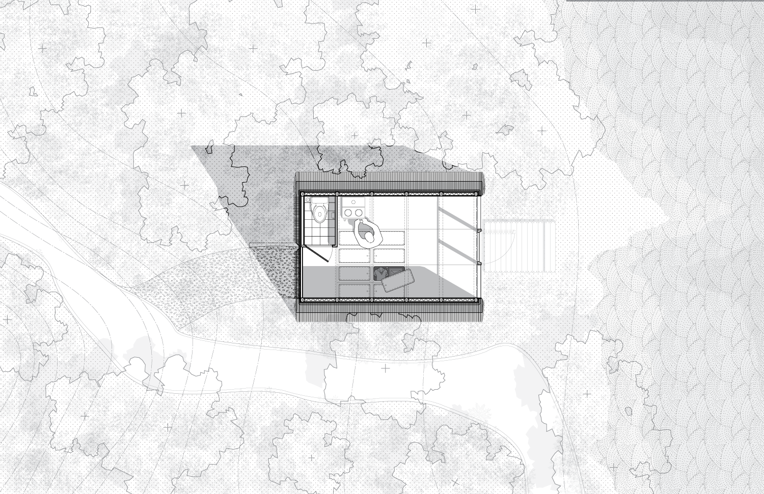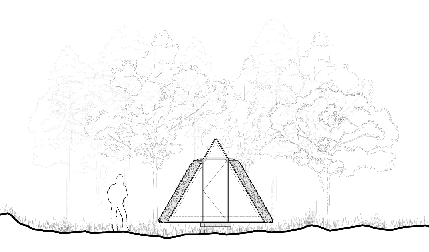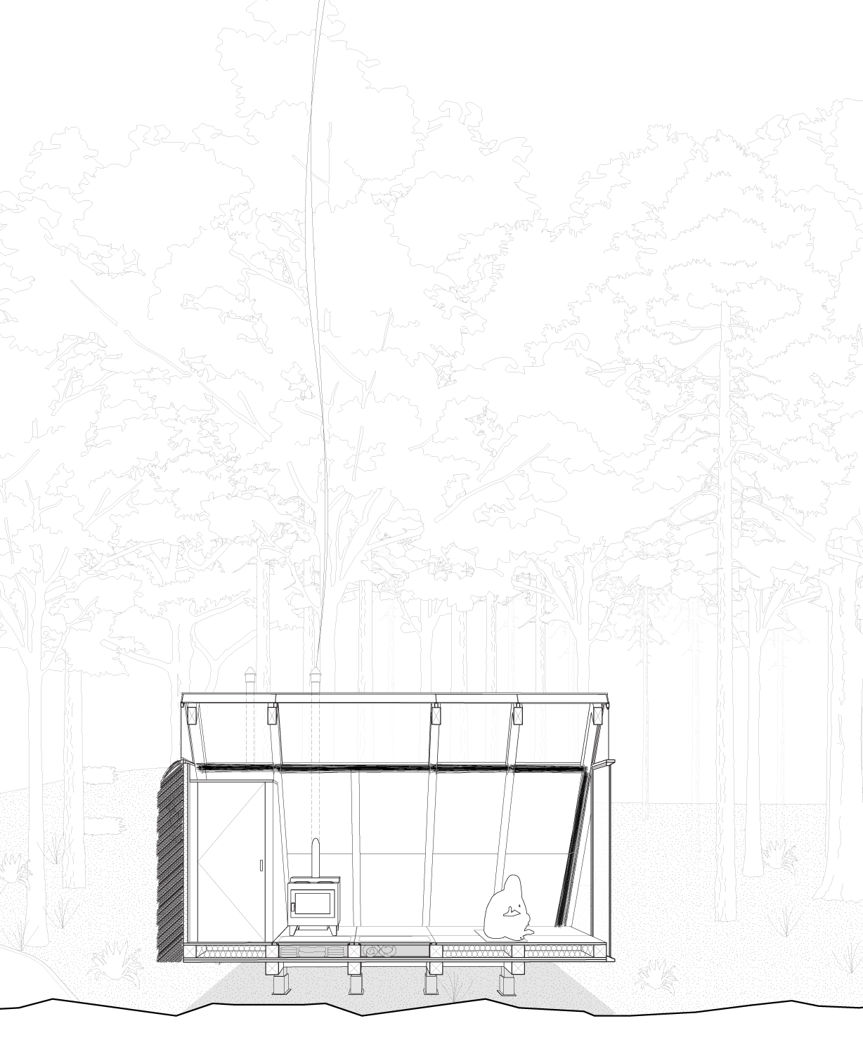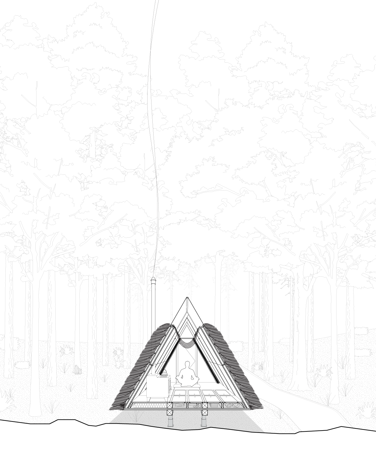Nestled into the Ozolini forest is a pure form balanced in the ideas of Vipassana meditation and the Latvian vernacular. The elevated cabin uses sustainable materials and construction methods to allow for the least impact on the site and surroundings. The cabin is split into the entrance, the living space, and the meditation space. The surrounding environment is brought into the cabin through the south facing glazed wall. The simple, adjustable frame and modular construction process gives the cabin the ability to adapt to different locations and different users.