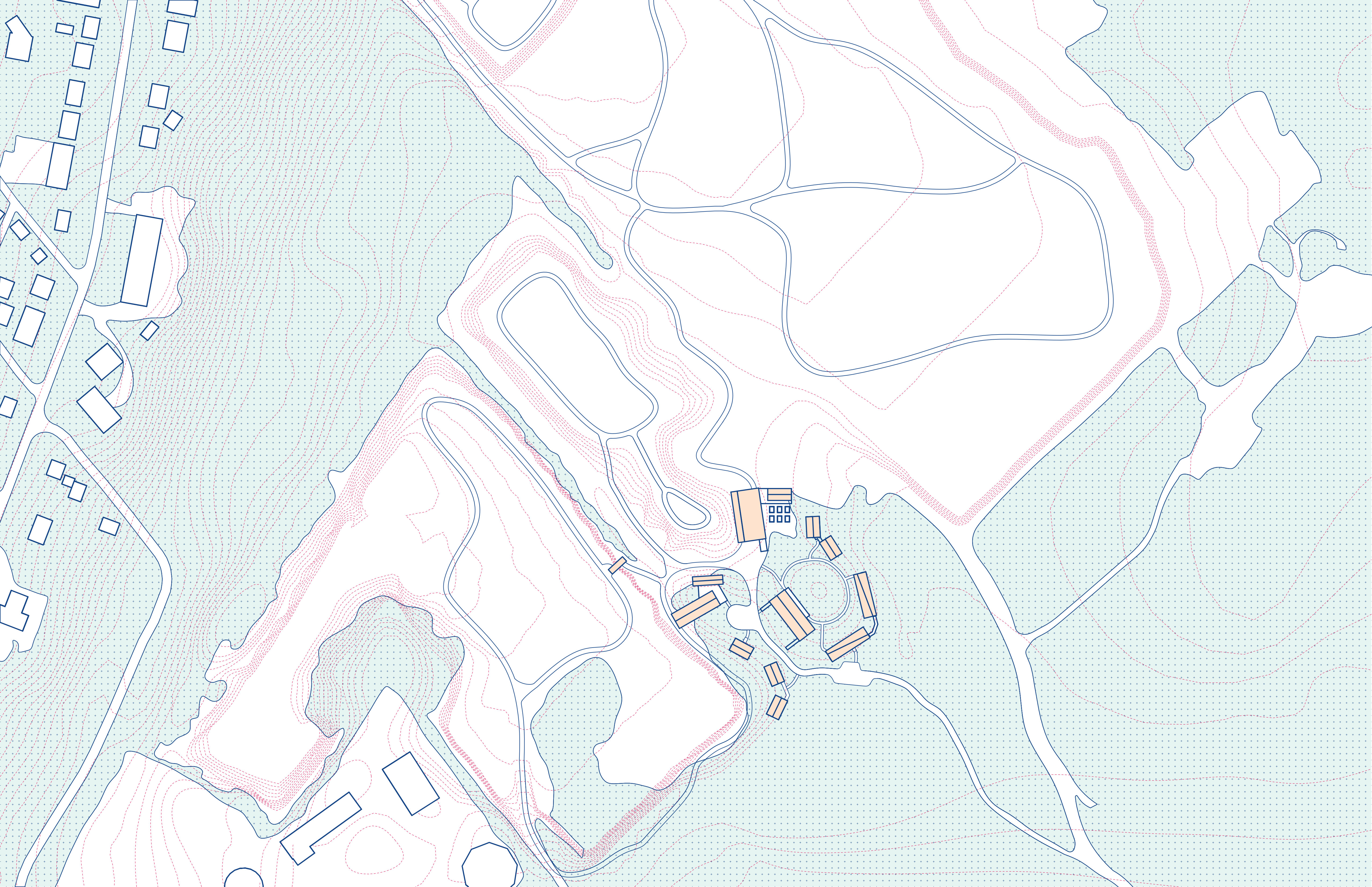 Most of the buildings are designed to sit above the ground in order to touch lightly on the land and for flexibility of placement. The buildings of the field station primarily follow the topography of the site creating a central community space between the dining hall and the shared cabins. Programs such as the gathering space sit perpendicular to the topography, protruding over one of the quarries.