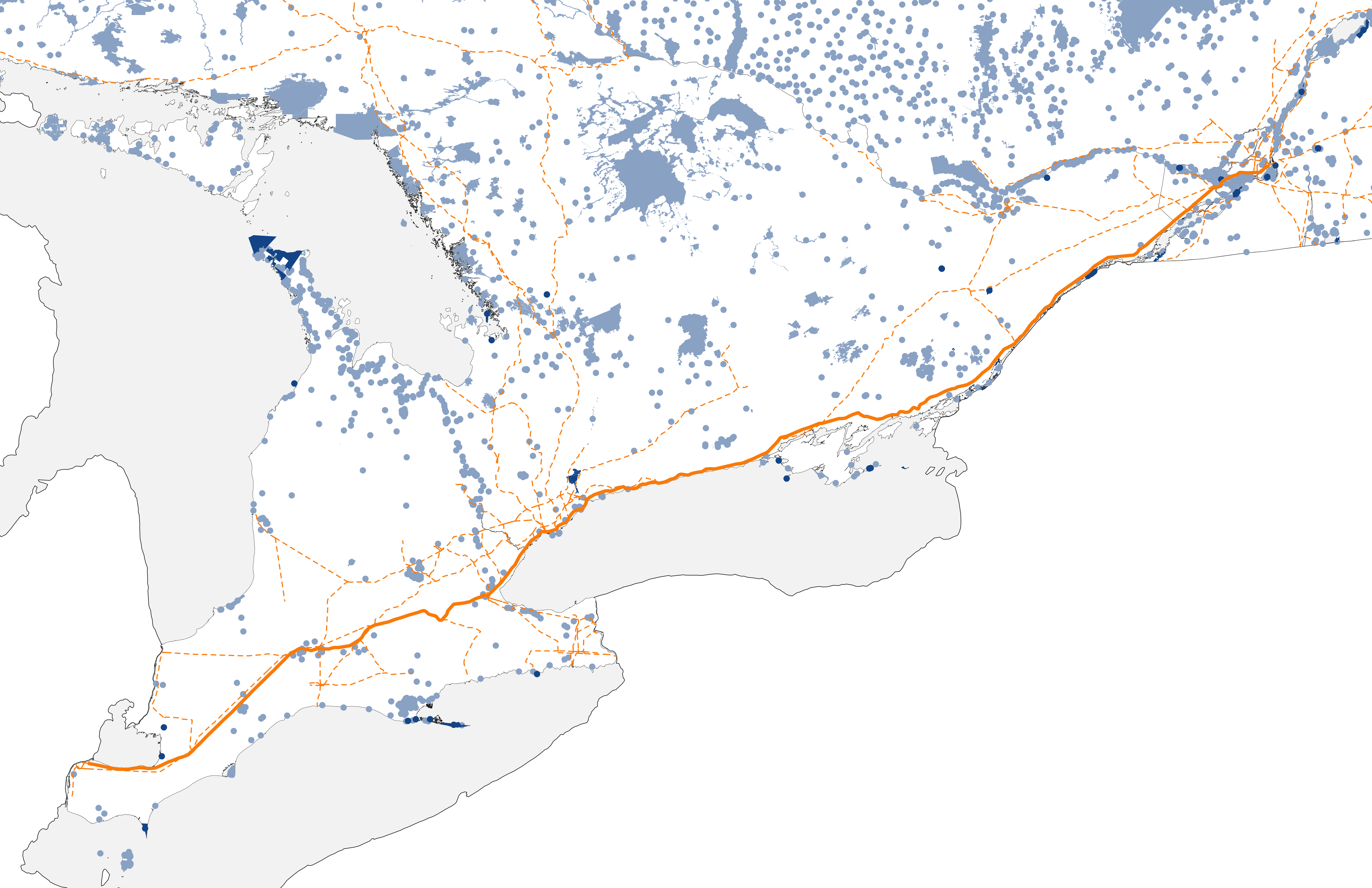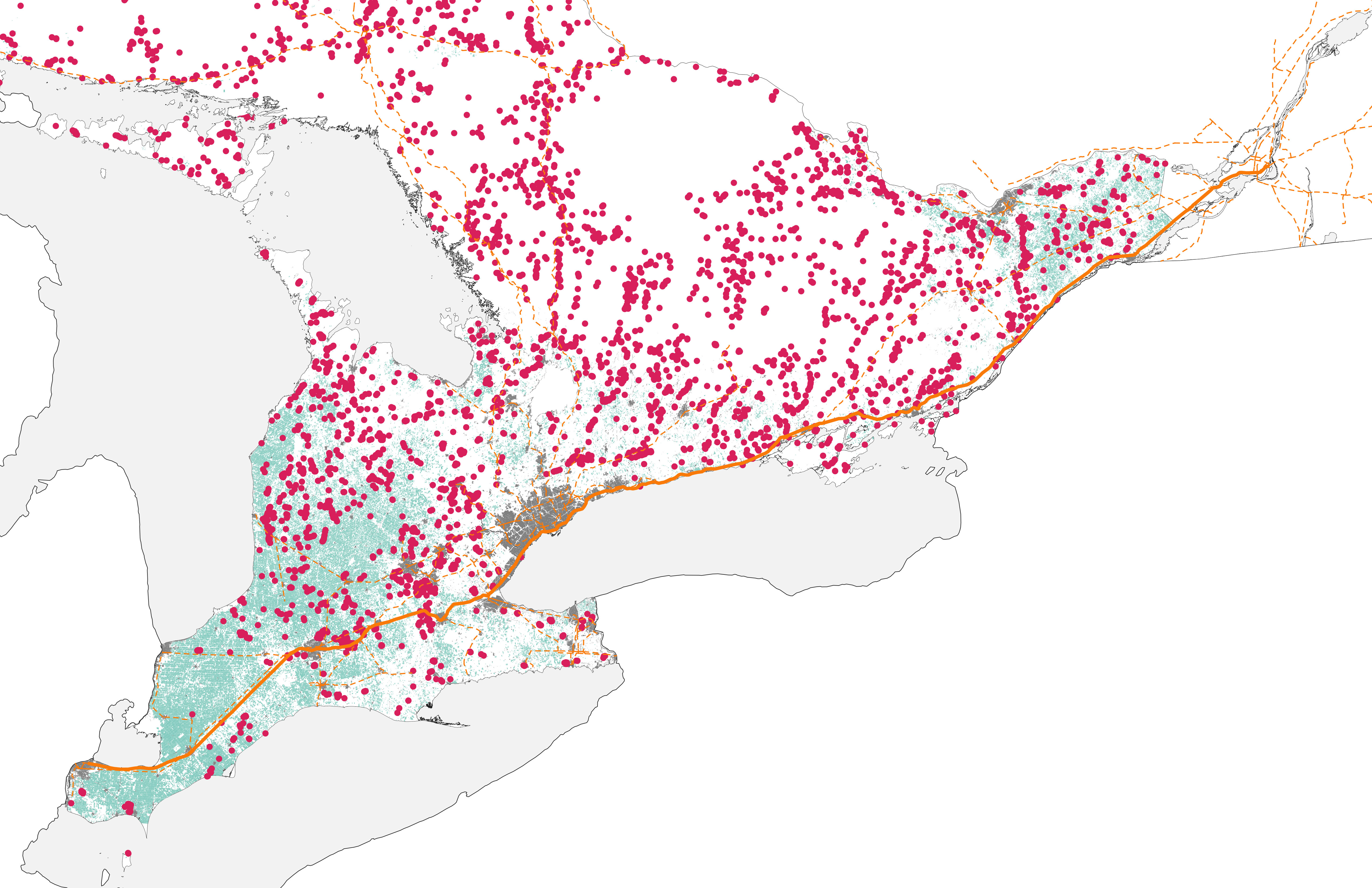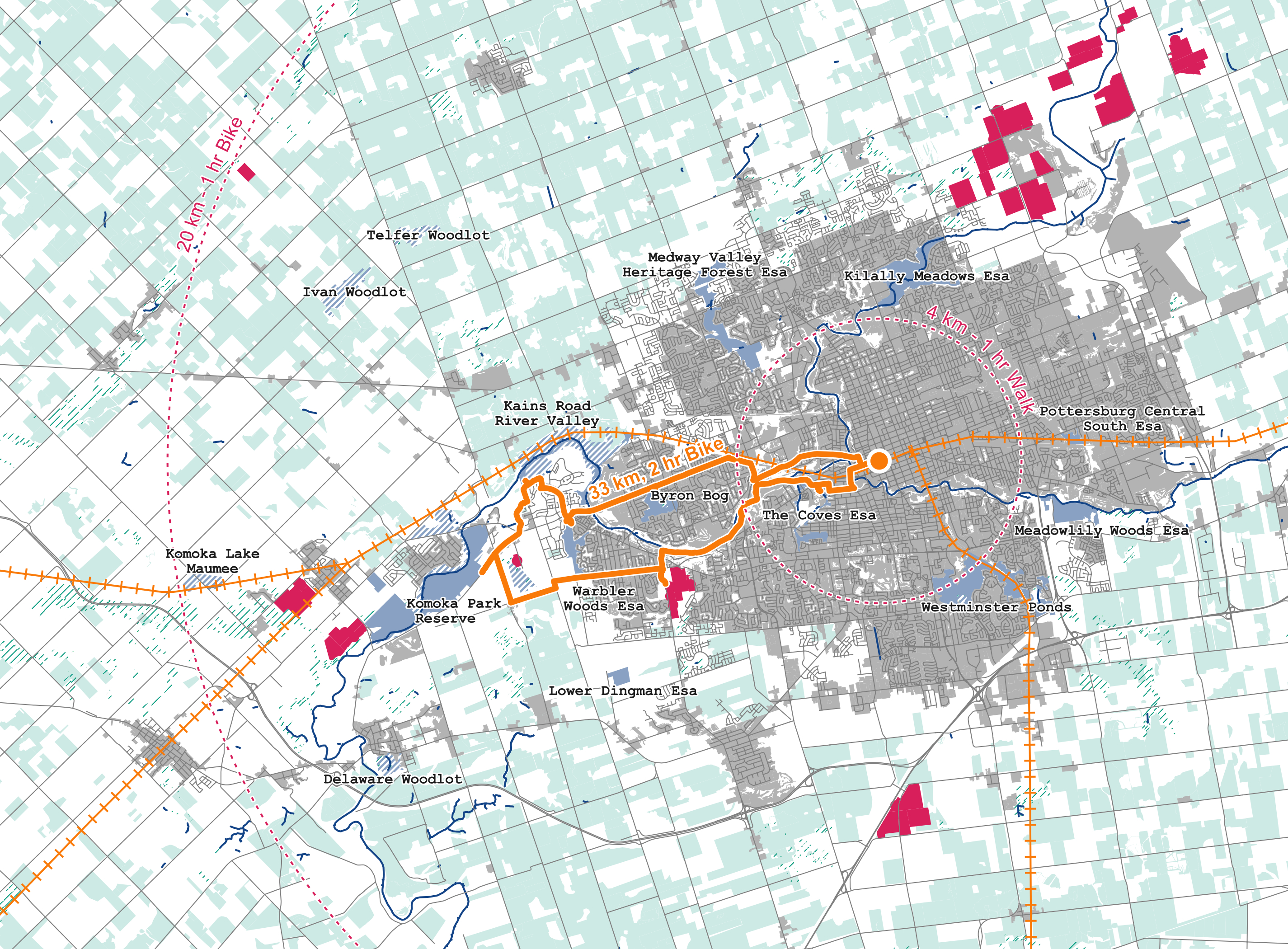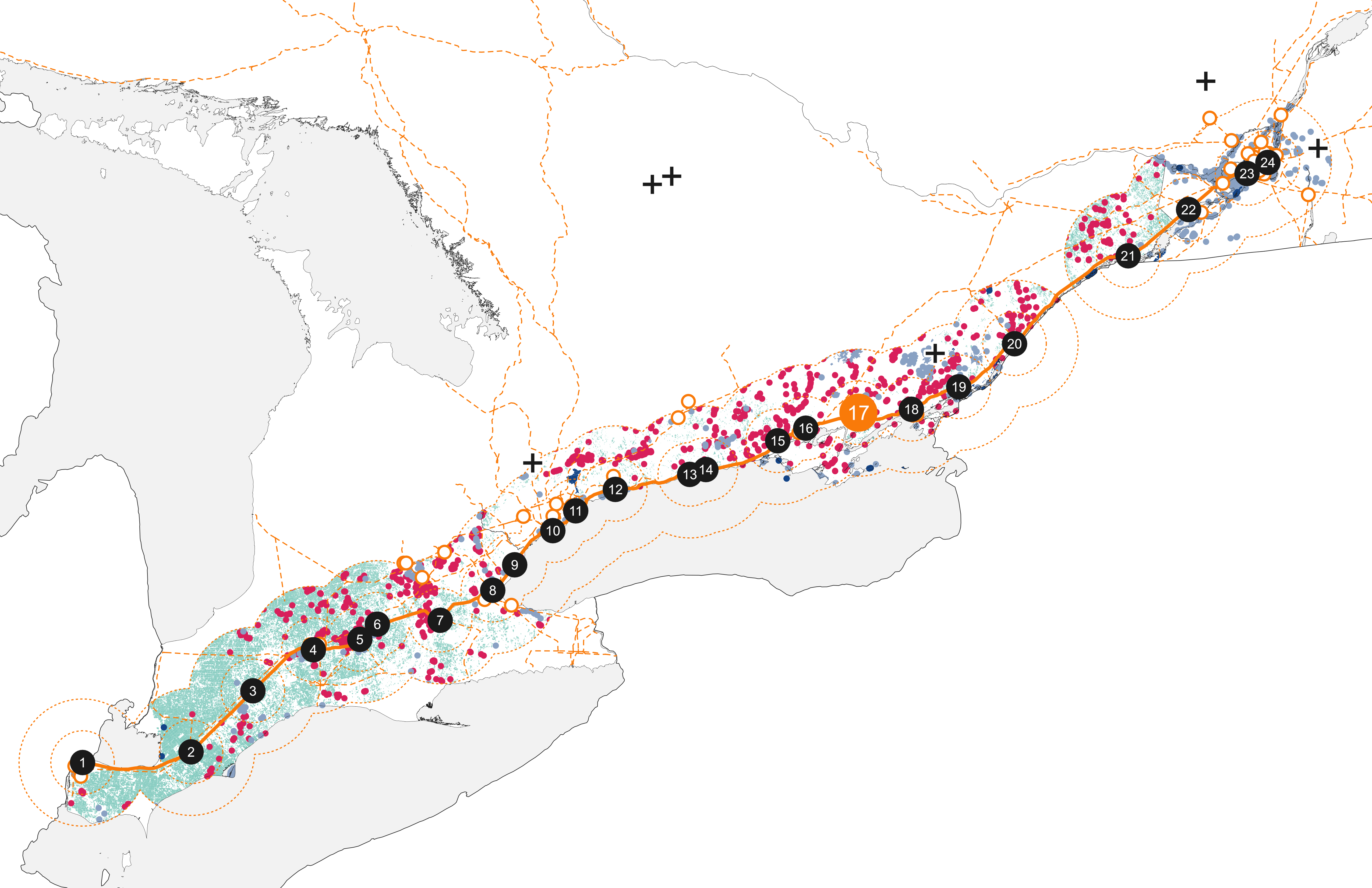 The map encapsulates the core focus of the thesis project, representing the Windsor-to-Montreal railway line, dissected into twenty-four stops along the line of varied size and ridership. This extensive network intersects with diverse natural protected areas, emphasizing the integration of the natural realm into daily human life. Overlaid on this railway network are layers denoting human engagement: urban areas, agricultural properties, and quarries as examples of sites of industry, emblematic of the southern Ontario region's geological context. Moreover, the map pinpoints educational potential, featuring multiple nearby post-secondary institutions and research field stations, crafting an interconnected educational narrative of human-environment coexistence, and understanding.