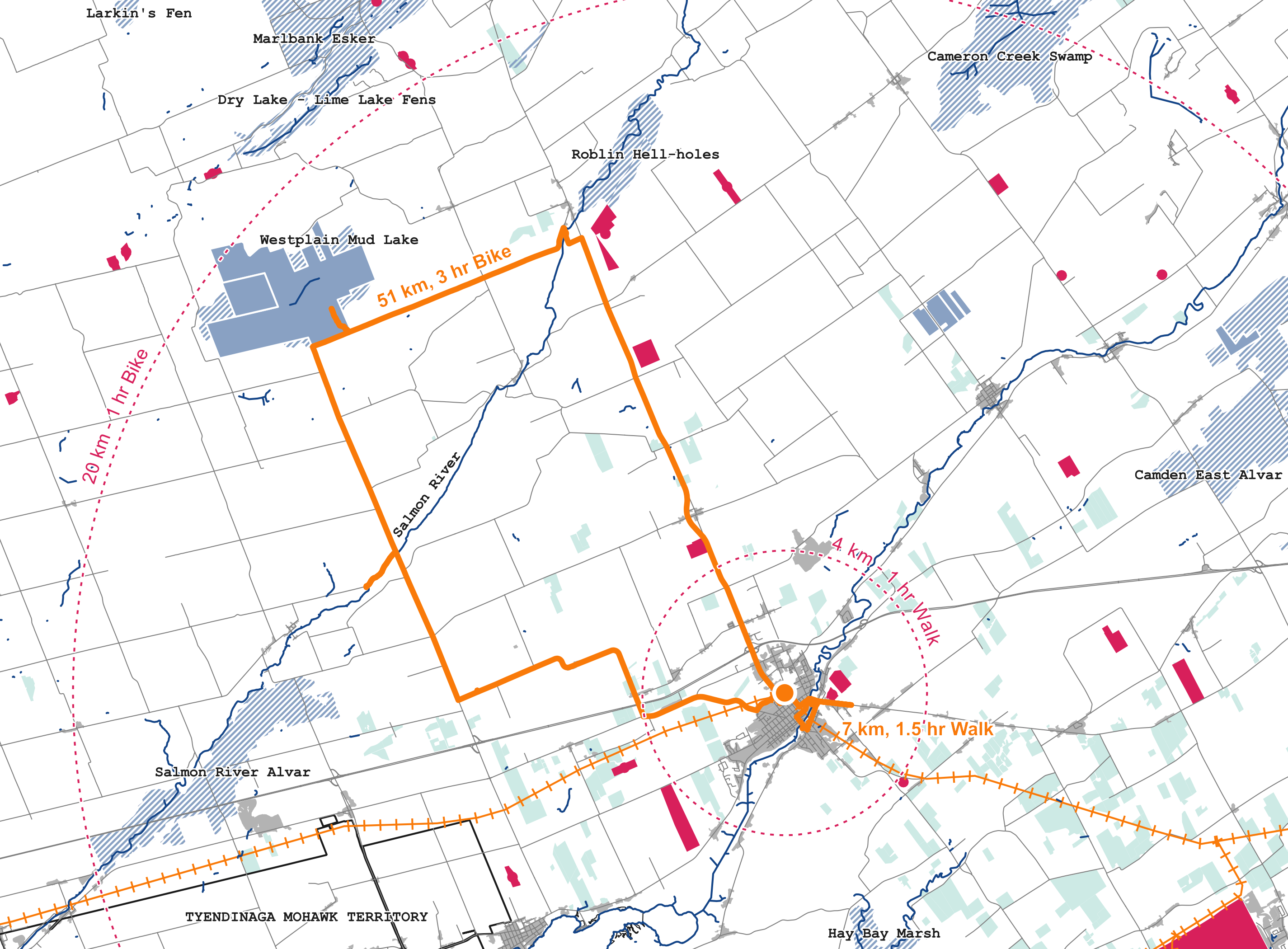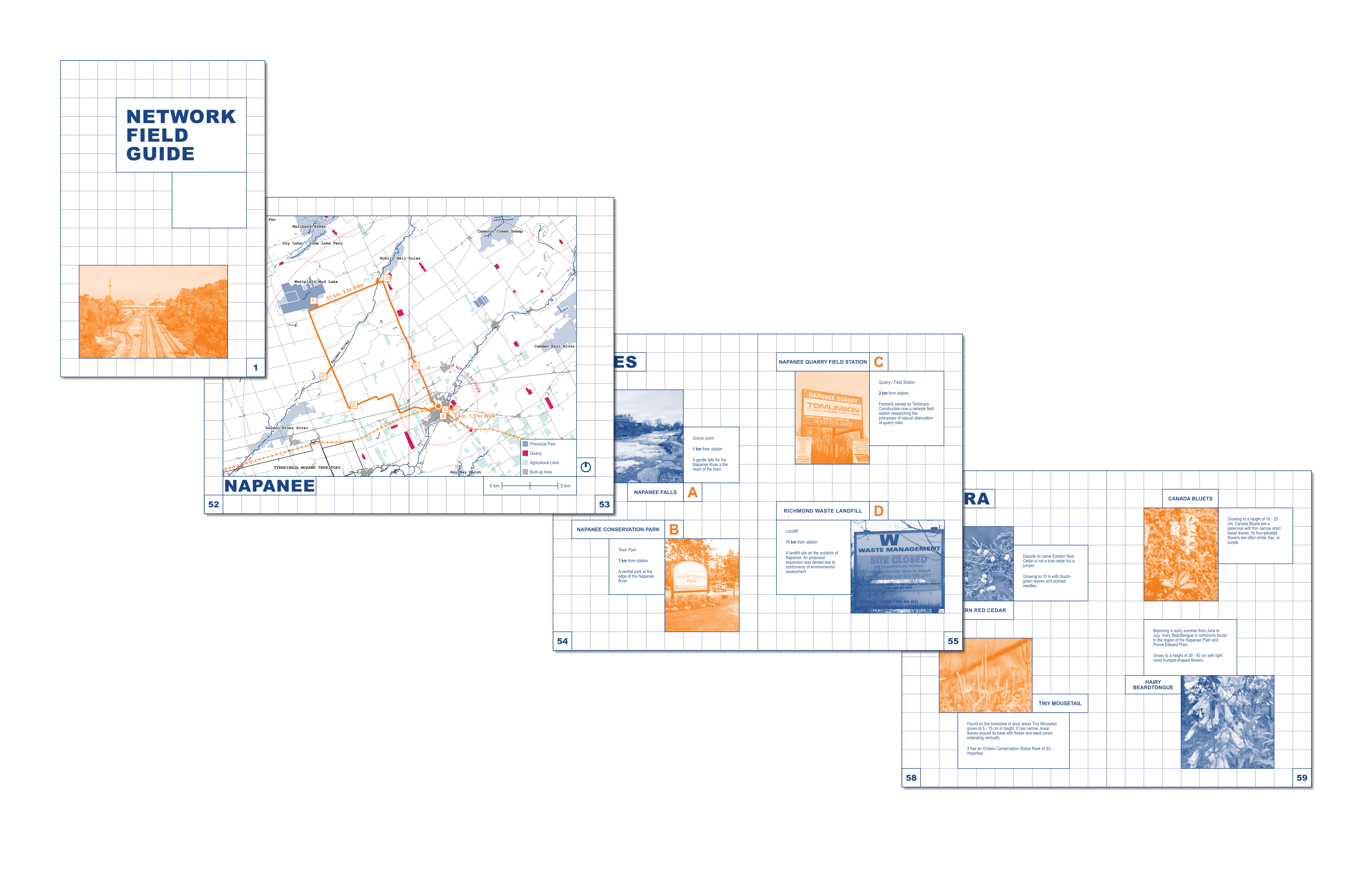 The secondary intention of the Ontario-wide network would be the creation of a comprehensive field guide showcasing natural protected areas and industrial sites along the Windsor-Montreal rail line. This guide meticulously examines each stop, offering insights into conservation areas, agricultural landscapes, and industrial zones like quarries. Illustrated maps spotlight both nature preserves and industry locales, along with suggested walking or biking routes for exploration of these sites. Through historical context and environmental insights, this guide unveils the intricate relationship between the natural realm and Southern Ontario's settlement sites. It unveils the region's flora, fauna, and the nuanced coexistence of diverse environments, rendering this information accessible and visible to all.