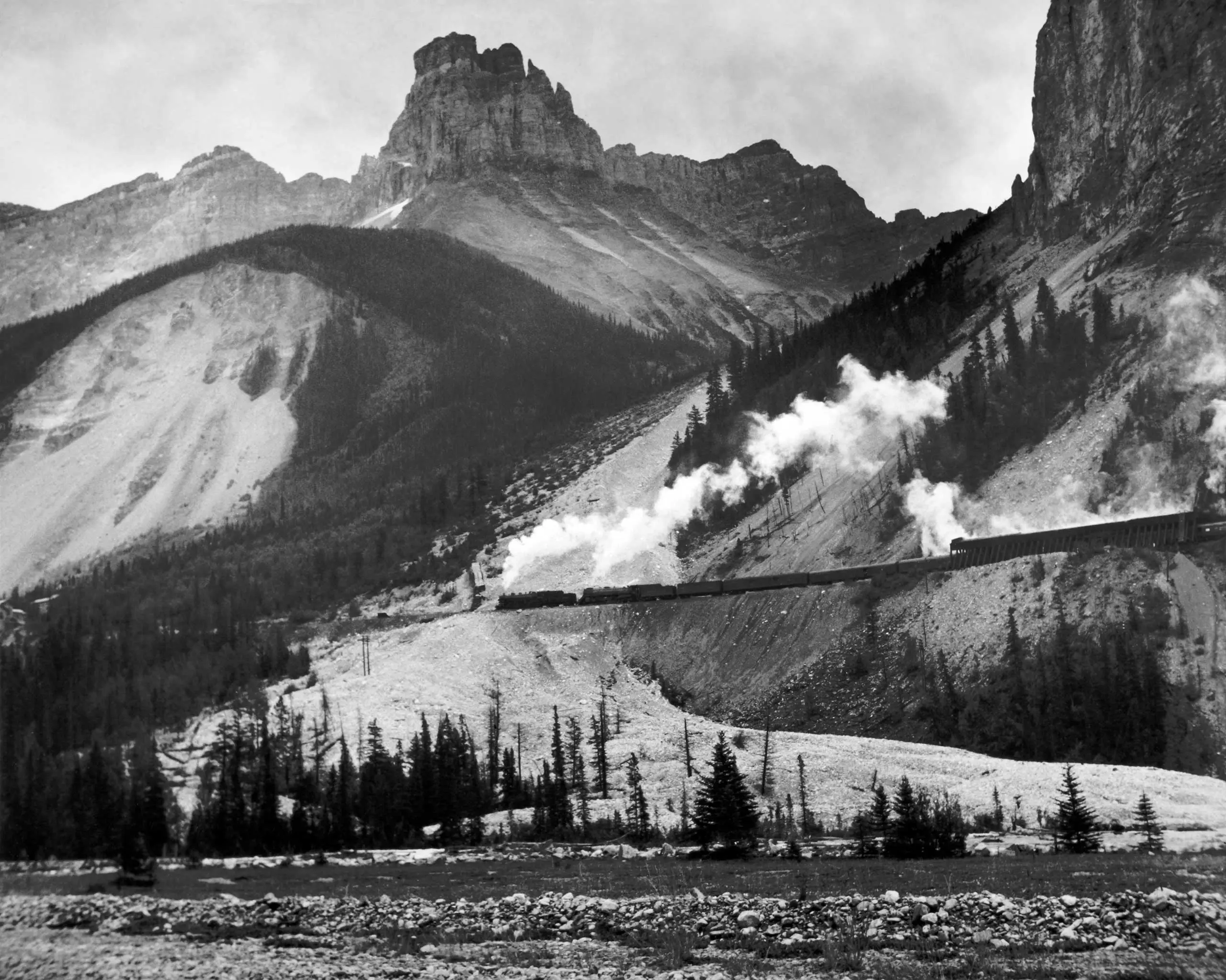 A freight train moves through the mountains of the President Range, Yoho National Park, British Columbia, Canada, National Film Board of Canada, 1951.