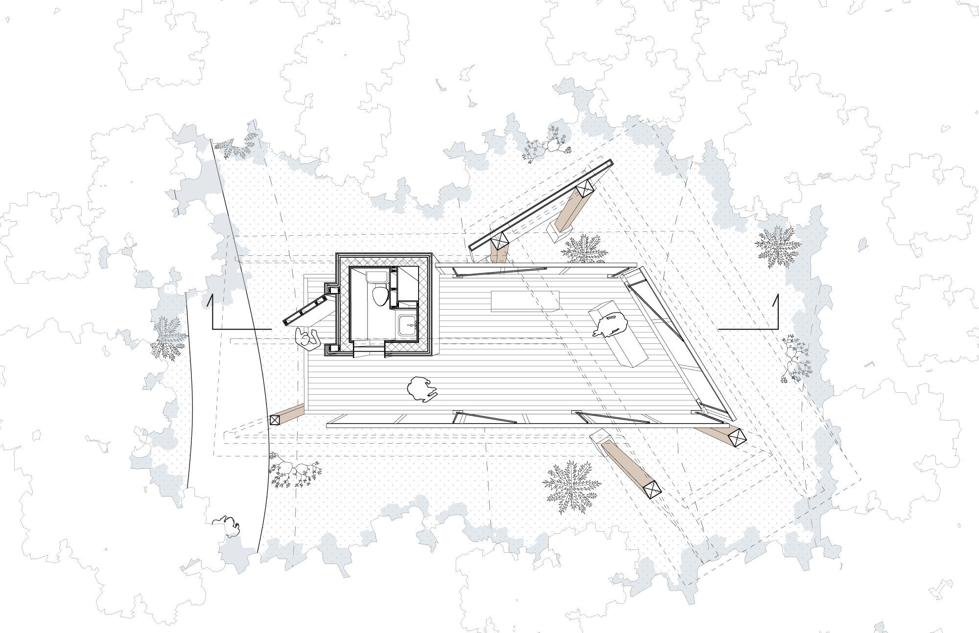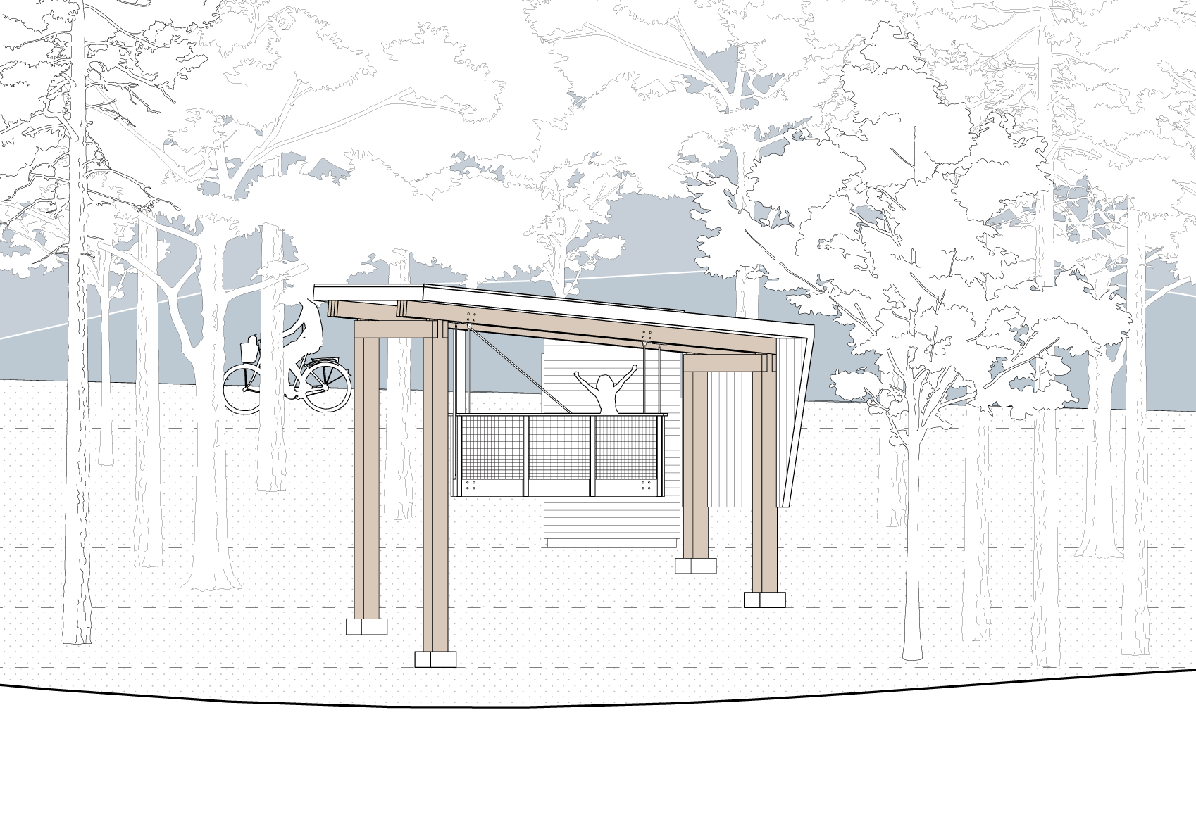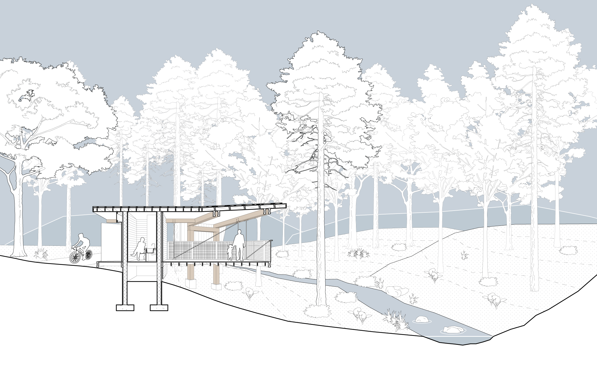 Located within a ravine-like forest the Tiny Trail runs along the hills, bridging over a winding creek at multiple points. The trail is used by many local residents for walking, running, and biking throughout most times of the year. The rest stop provides a washroom as well as a bike pit-stop for simple repairs. Drawing from its topographical context, the rest stop suspends itself out towards the creek from the large wooden members. This gives the visitor a different experience from the trail while limiting the impact of its site.