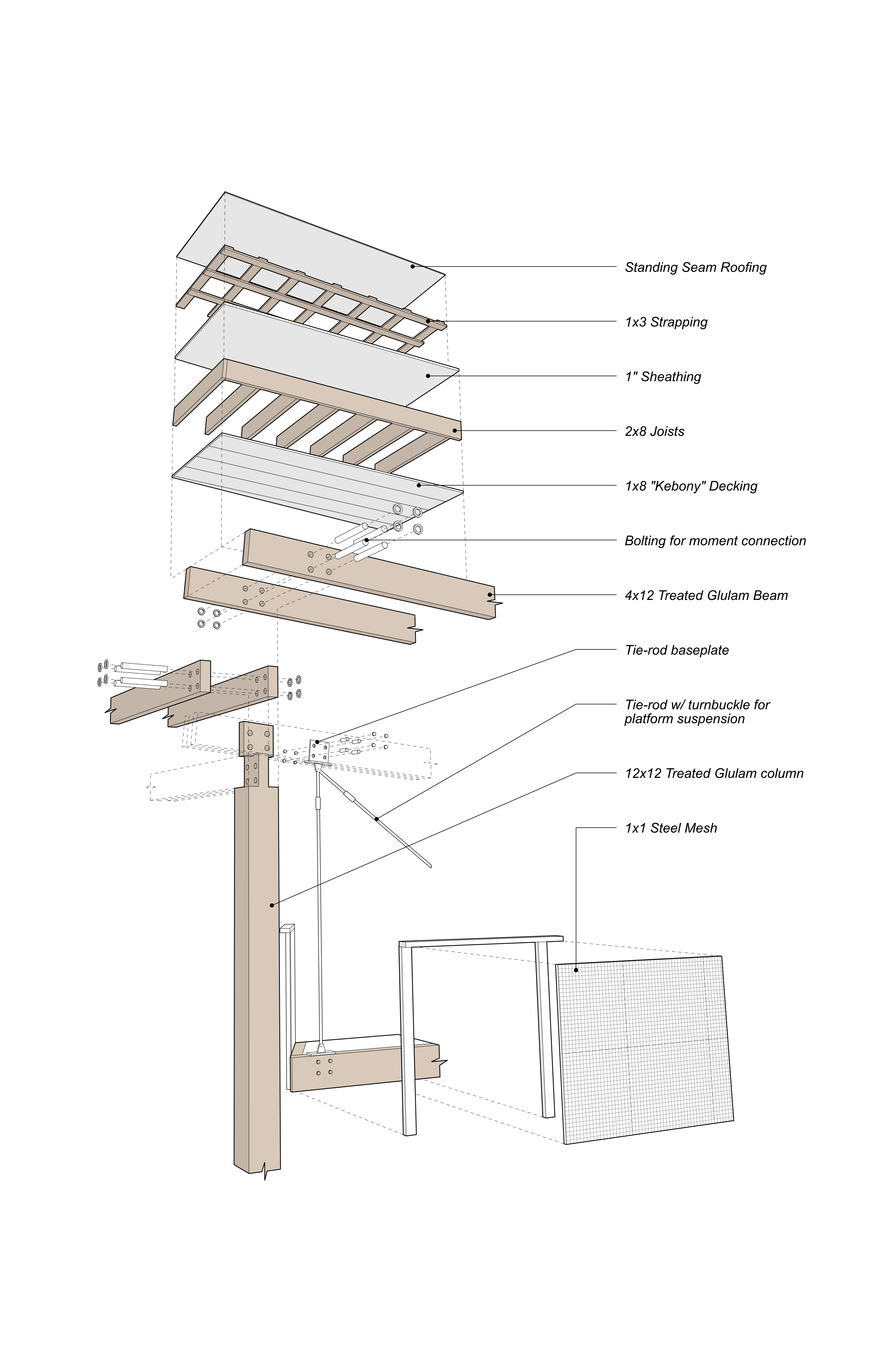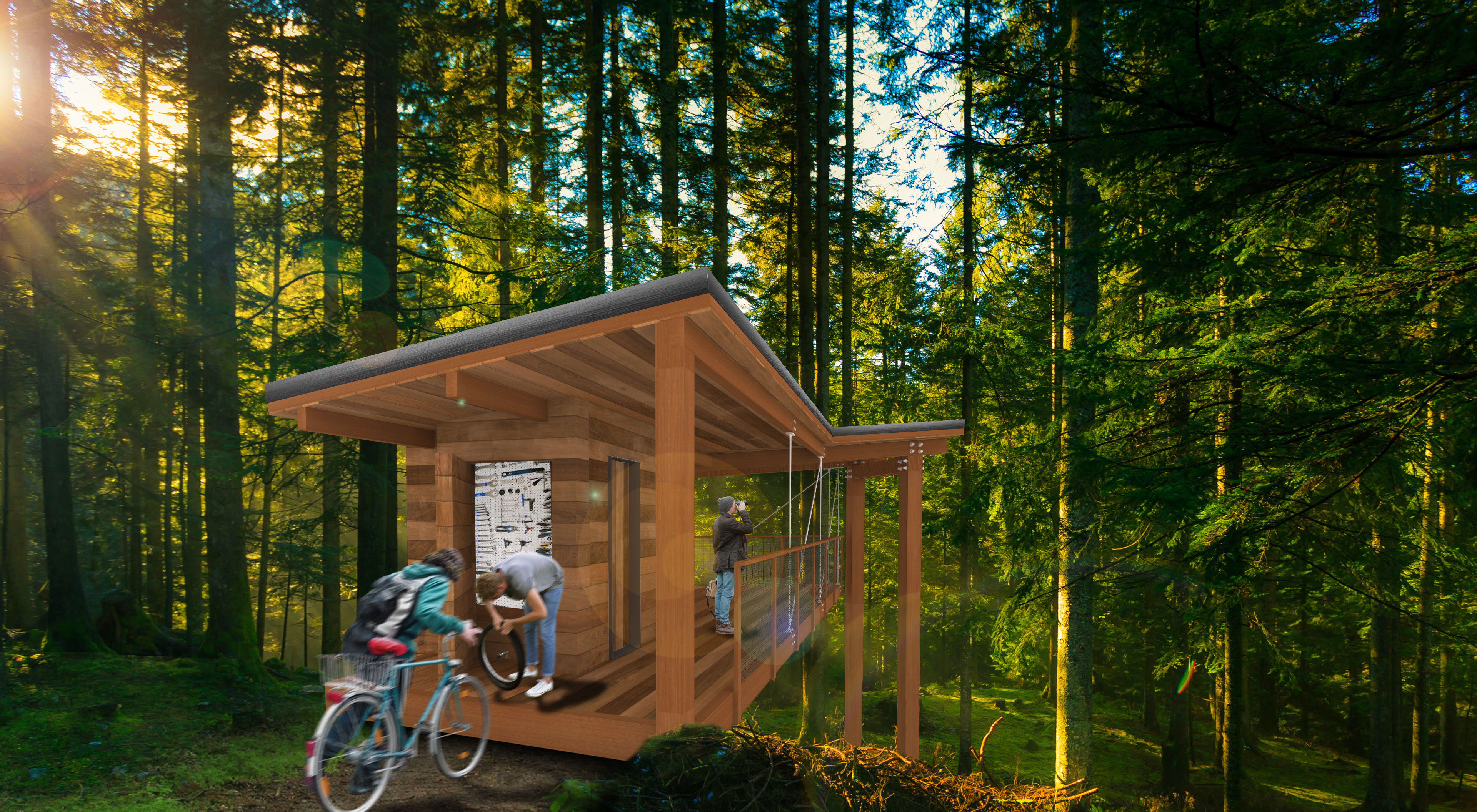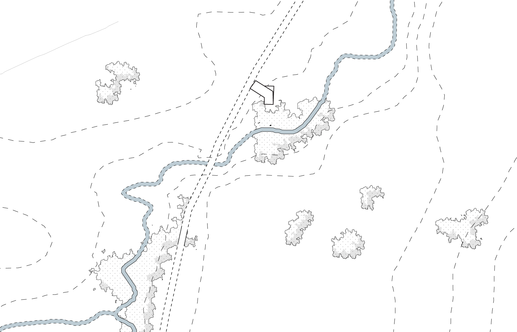 Located within a ravine-like forest the Tiny Trail runs along the hills, bridging over a winding creek at multiple points. The trail is used by many local residents for walking, running, and biking throughout most times of the year. The rest stop provides a washroom as well as a bike pit-stop for simple repairs. Drawing from its topographical context, the rest stop suspends itself out towards the creek from the large wooden members. This gives the visitor a different experience from the trail while limiting the impact of its site.